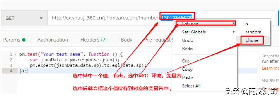 \2. 在以上的位置把想要的值选中右击,选中Set:环境|全局 ,选中一个变量名,点击后就会保存到这个变量中