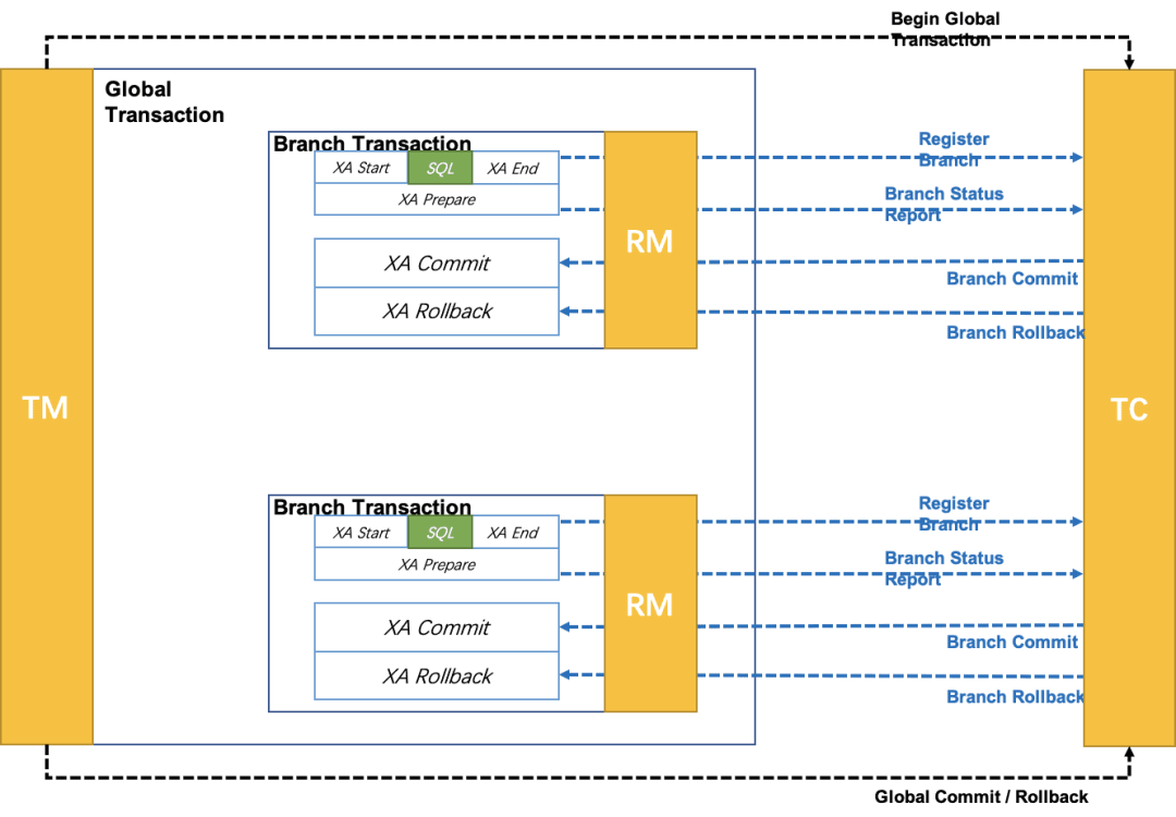 TC (Transaction Coordinator) - 事务协调者:维护全局和分支事务的状态,驱动全局事务提交或回滚。 TM (Transaction Manager) - 事务管理器:定义全局事务的范围,开始全局事务、提交或回滚全局事务。 RM ( Resource Manager ) - 资源管理器:管理分支事务处理的资源( Resource ),与 TC 交谈以注册分支事务和报告分支事务的状态,并驱动分支事务提交或回滚。