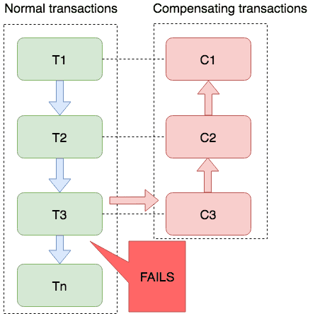 绿色的都是正常的流程,红色的则是发生异常后回滚的流程。回滚中也是一种反向补偿。