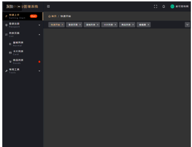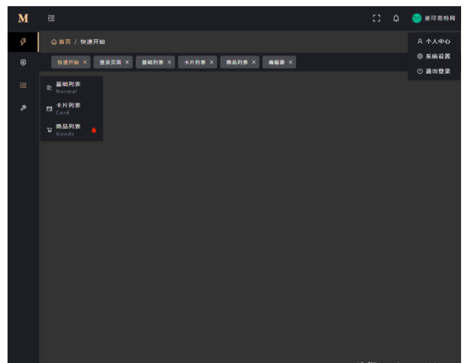 左侧菜单通过全局变量 $g 进行配置。也就是说,菜单 menu 完全可以根据权限系统配置,通过接口等的方式获取后再赋值形成菜单列表,菜单的字段属性符合 RouteRecordRaw 即可,其中内含的 meta 属性,自定义性质比较强,所以 icon tag 等都包含在这个属性内进行判断渲染了。