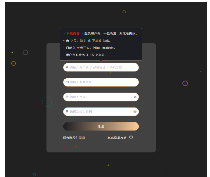 注册效果与登录的差不多,加了一些内容输入时的弹窗实时提醒信息。