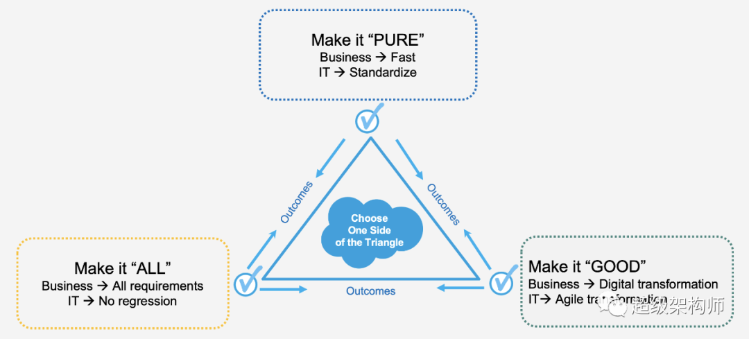 为了成功实现数字化转型并降低这些风险,建议公司从三个可能的目标中选择最有可能单独实现且彼此最兼容的两个目标。例如,追求“纯”快速和标准化 Salesforce 实施的公司将难以在不损失功能的情况下满足所有业务需求。