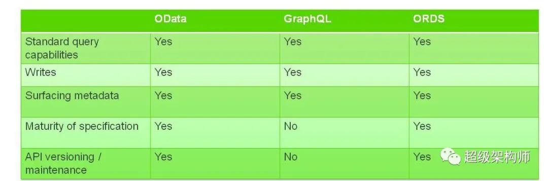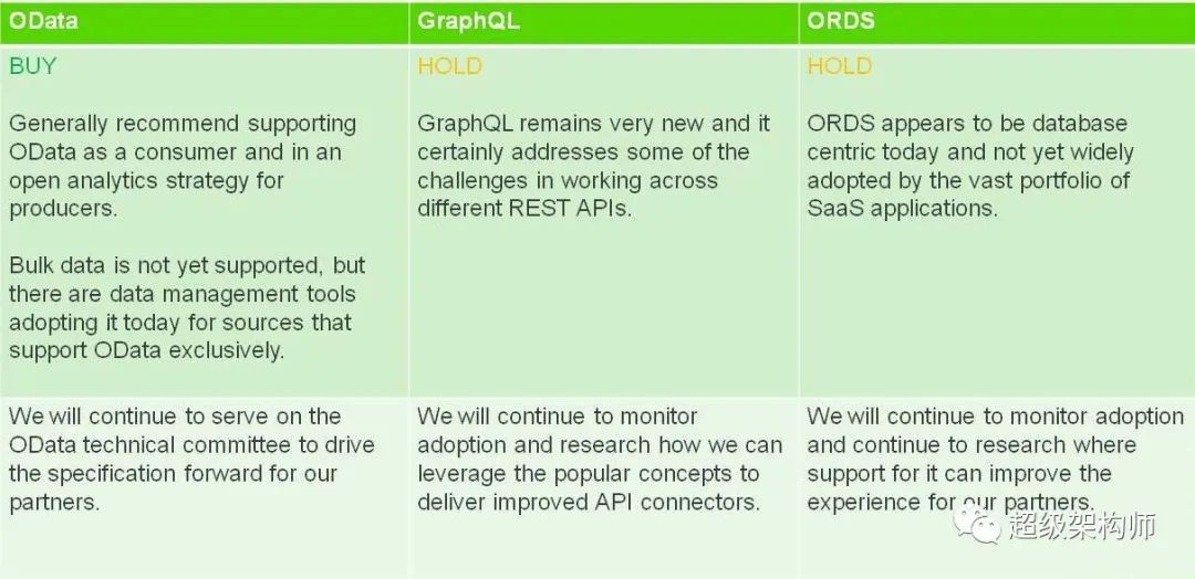 对比图 1 中的标准 API 的标准是基于实现与多个数据源的互操作性。关于这种比较需要注意的一点是规范的成熟度。尽管 GraphQL 越来越受欢迎,但在广泛采用、最佳实践和工具方面的成熟度仍然存在问题。