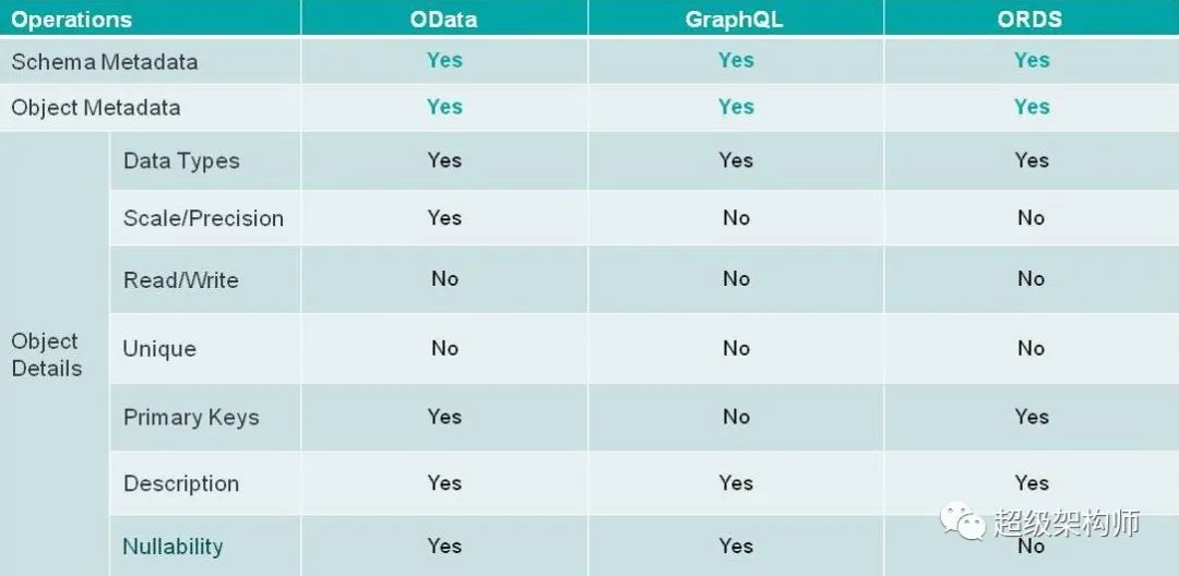 这些 API 中的每一个都在努力解决这个问题,但是 GraphQL 和 ORDS 不会告诉您数据的规模和精度,而 OData 会。GraphQL 也不会告诉您主键,ORDS 也不会告诉您可空性。此信息对于应用程序能够知道它可以对每个特定字段做什么和不能做什么很重要。