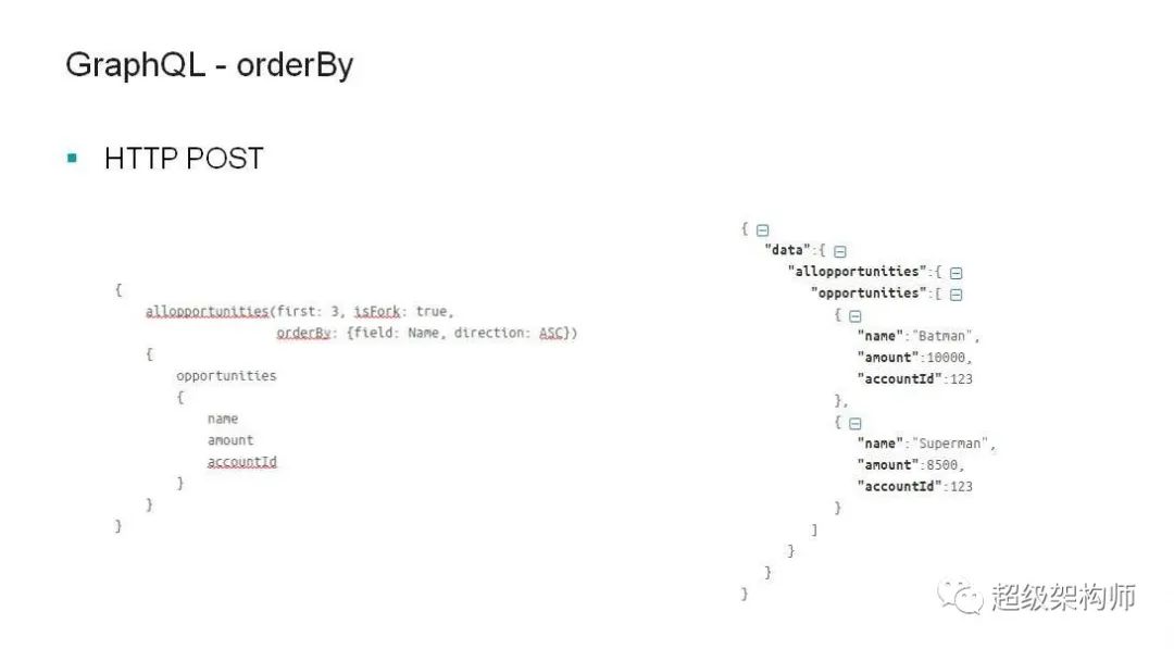 为了直观地说明使用这些 API 的差异,以下两个代码示例展示了如何在 GraphQL 和 OData 中执行“排序依据”。