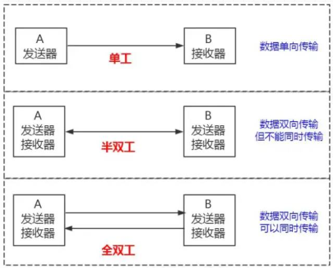 「半双工」:指的某一时刻,要么发送数据,要么接收数据,不能同时。例如早期对讲机