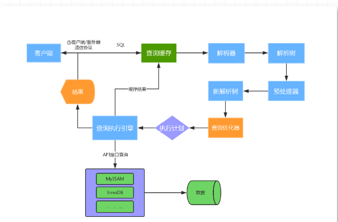 确定最优执行计划后,SQL语句交由存储引擎处理,存储引擎会在存储设备中取得相应的数据,并原路返回给客户端。