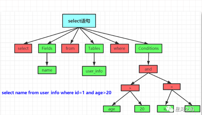 「当查询缓存没有命中时,客户端发送的SQL会被解析器进行语法解析,生成【解析树】,对sqlj进行语法分析」,生成解析树如下: