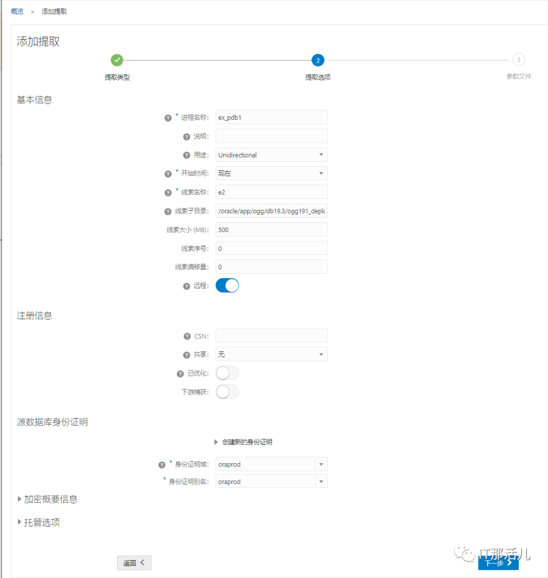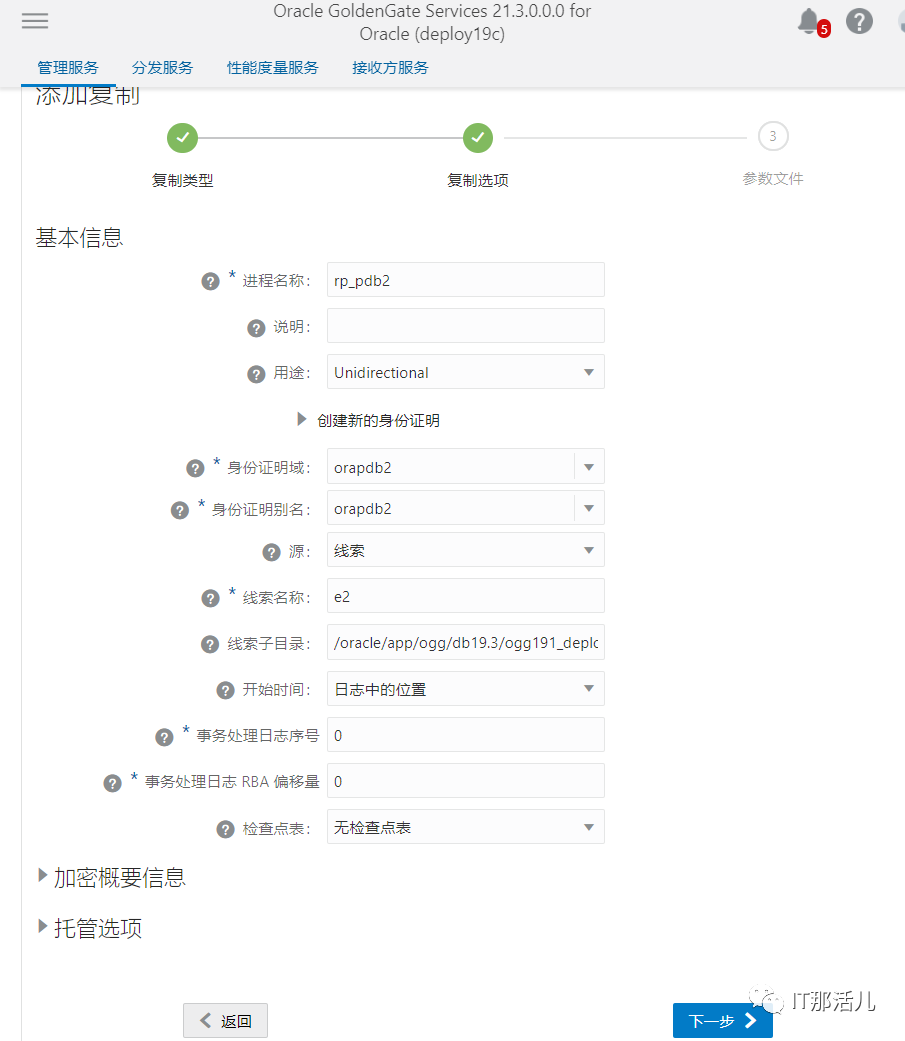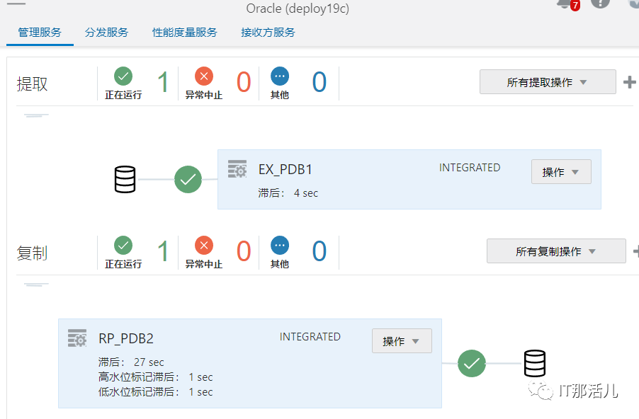 Admin server: 用于创建用户、添加附加日志、创建抽取和投递进程,类似在ggsci命令下添加附加日志、extract、replicat进程; Distribution server:用于创建传输进程,类似于以前的pump进程; Receiver server:用于监控接收进程,类似于以前的server collector进程; Performance metrics server:性能监控,这个里面信息非常多,例如ADMINSRVR包括进程性能,线程性能以及进程状态与配置,非常详细与直观。