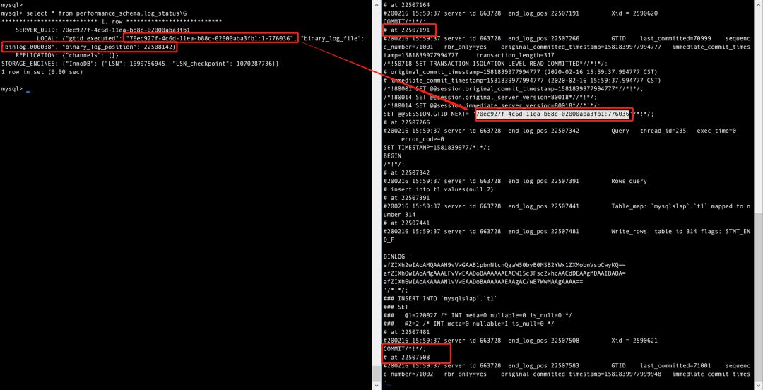 performance_schema.log_status得到的 binlog position 与 GTID 是一致的,且备份恢复后 show master status 显示的信息也与 xtrabackup_binlog_info 文件记录的信息一致。