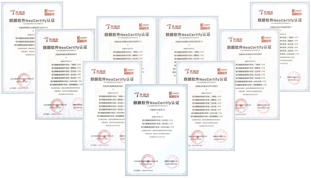 麒麟软件积极建设网络安全产品生态,携手天融信打造基于麒麟操作系统为安全底座的网络安全产品,包含安全防护、安全接入、安全检测、安全审计、数据安全、云安全、工控安全、云计算、安全管理、终端安全等十余个领域,总计超过百款软硬件产品,均已在飞腾、海光、龙芯、兆芯、鲲鹏平台完成了产品兼容性、功能性、安全性、可靠性及性能测试。麒麟操作系统助力天融信国产化领域网络安全产品实现各行业全场景覆盖。