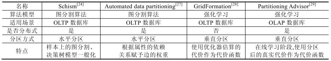 表2 对比了近年来数据库分区的新方法:Schism 与ADP 通过将问题转换为图分割问题,再用机器学习模型从学习图分割中学习分区策略,ADP 在Schism 的基础上为表示数据依赖关系的边赋予了不同的权重,使之变为带权图的图分割问题,获得了比Schism 更好的结果;GridFormation 和Partitioning Advisor 则将强化学习的思想应用于分区,GridFormation 使用每次分区后估算的查询性能表现作为代价函数,使其训练开销小于使用真实代价作为代价函数的Partitioning Advisor,但是其结果的可靠性受到代价估算模型的限制.