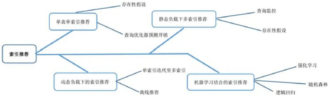 单表单索引推荐的提出,启发了人们对索引自动构建的思考,但是由于单表的限制,使得其使用范围极其狭窄;在单索引推荐基础上衍生的多索引推荐,适用范围更加广泛,它可以完成负载变化不是很频繁的应用的索引推荐工作,但是由于网络的普及以及用户数量的爆炸式增长,更多应用的负载都是不断变化的,所以研究人员把着眼点放到了动态负载下的索引推荐研究上,来解决负载快速变化的问题;在研究动态负载索引推荐的同时,机器学习的技术逐渐成熟,它在大规模数据的高效运用以及推荐预测方面的高准确率,引起了科研人员的注意,随后,诸多机器学习的算法被运用到了索引推荐的研究中.机器学习的加入,使得索引推荐不仅能够适应负载的快速变化,更能将大量的用户数据利用起来提高索引推荐的效果.