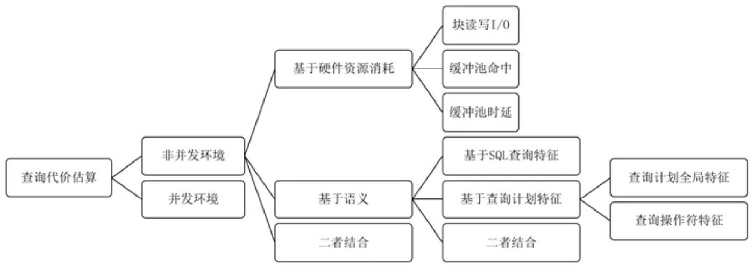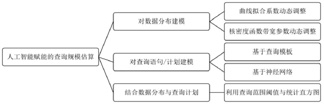 查询代价估算,通常指预测估算某个查询计划在给定硬件和系统参数配置下的执行时间和资源消耗.查询代价估算除了可以指导查询计划的选择,对查询调度、数据库资源管理等也有重要意义.但随着数据库变得越来越复杂,负载类型越来越多样,量化CPU 和I/O 的代价变得越来越困难,传统的代价估算模型在估算准确性上的表现不尽人意.除了提高查询规模估算准确率以优化查询代价估算,一些工作也将人工智能技术直接用于查询代价估算,其分类如图4 所示.