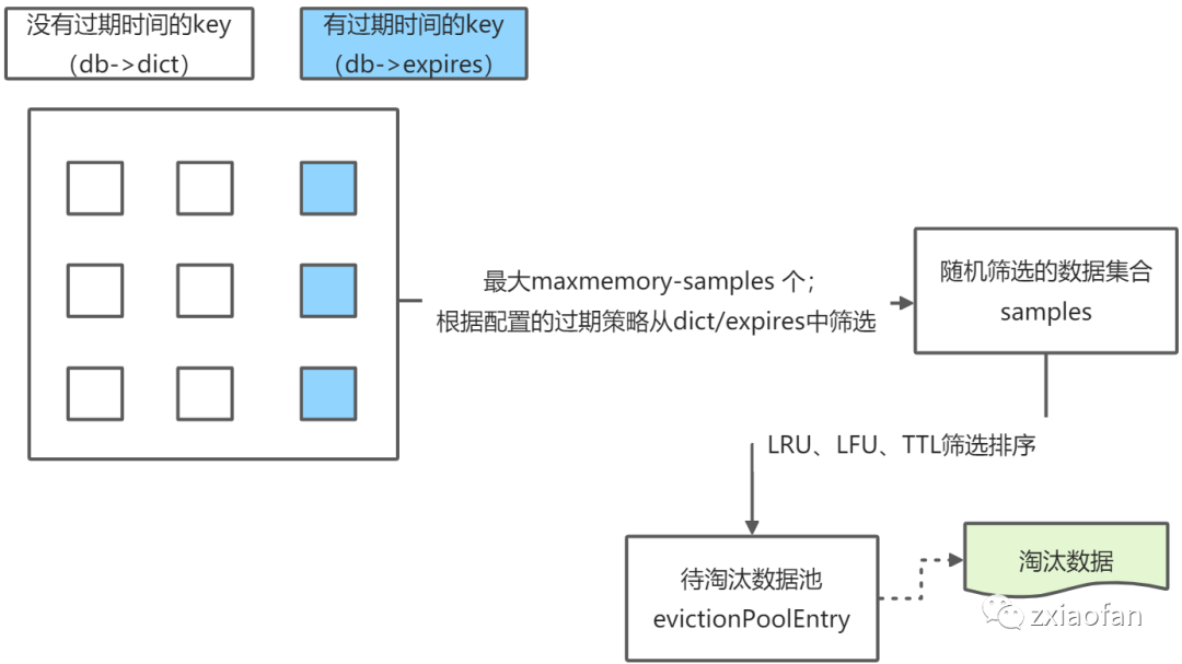 // 源码位于 evict.c,公众号 zxiaofan。/* This is a wrapper for freeMemoryIfNeeded() that only really calls the * function if right now there are the conditions to do so safely: * * - There must be no script in timeout condition. * - Nor we are loading data right now. * */int freeMemoryIfNeededAndSafe(void) { if (server.lua_timedout || server.loading) return C_OK; return freeMemoryIfNeeded();}// 源码位于 evict.cint freeMemoryIfNeeded(void) { // Redis内存释放核心逻辑代码 // 计算使用内存大小; // 判断配置的数据淘汰策略,按对应的处理方式处理; void evictionPoolPopulate(int dbid, dict *sampledict, dict *keydict, struct evictionPoolEntry *pool) { ... }}// 【待淘汰数据池 evictionPoolEntry】填充 evictionPoolPopulate// 源码位于 evict.c/* This is an helper function for freeMemoryIfNeeded(), it is used in order * to populate the evictionPool with a few entries every time we want to * expire a key. Keys with idle time smaller than one of the current * keys are added. Keys are always added if there are free entries. * * We insert keys on place in ascending order, so keys with the smaller * idle time are on the left, and keys with the higher idle time on the * right. */void evictionPoolPopulate(int dbid, dict *sampledict, dict *keydict, struct evictionPoolEntry *pool) { // sampledict :db->dict(从所有数据淘汰时值为 dict) 或 db->expires(从设置了过期时间的数据中淘汰时值为 expires); // pool : 待淘汰数据池 // 获取 最多 maxmemory_samples 个数据,用于后续比较淘汰; count = dictGetSomeKeys(sampledict,samples,server.maxmemory_samples);}// // 【待淘汰数据池 evictionPoolEntry】// 源码位于 evict.c// EVPOOL_SIZE:【待淘汰数据池】存放的数据个数;// EVPOOL_CACHED_SDS_SIZE:【待淘汰数据池】存放key的最大长度,大于255将单独申请内存空间,长度小于等于255的key将可以复用初始化时申请的内存空间;// evictionPoolEntry 在 evictionPoolAlloc() 初始化,而initServer() 将调用evictionPoolAlloc()。#define EVPOOL_SIZE 16#define EVPOOL_CACHED_SDS_SIZE 255struct evictionPoolEntry { unsigned long long idle; /* key的空闲时间 (LFU访问频率的反频率) */ sds key; /* Key name. */ sds cached; /* Cached SDS object for key name. */ int dbid; /* Key DB number. */};static struct evictionPoolEntry *EvictionPoolLRU;