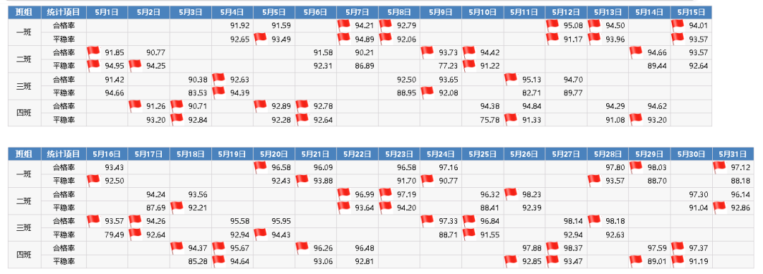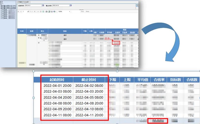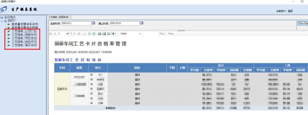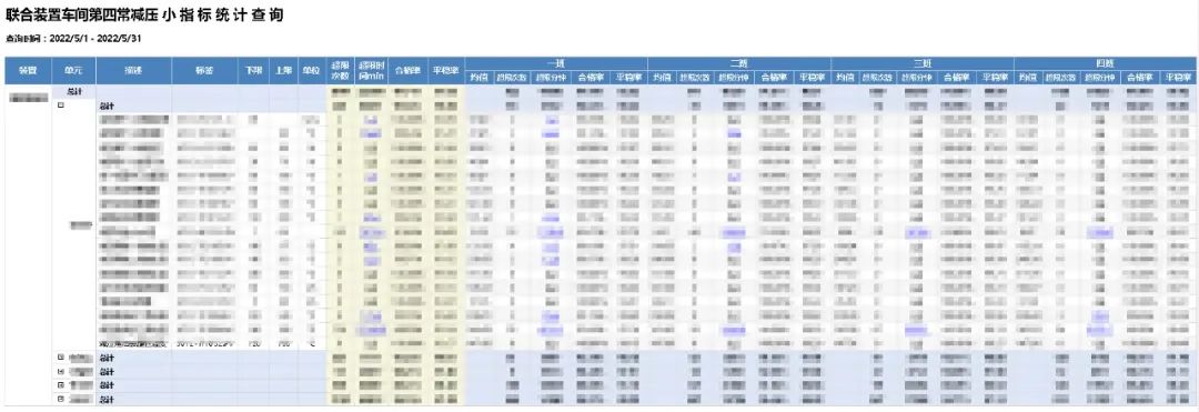工艺指标管理把工艺卡片所有1000余个指标纳入管理,通过控制上下限根据管理需求灵活调整,自动计算合格率、平稳率,并分班组、单元、车间统计。通过链接快速锁定不合格班次,并查看明细。