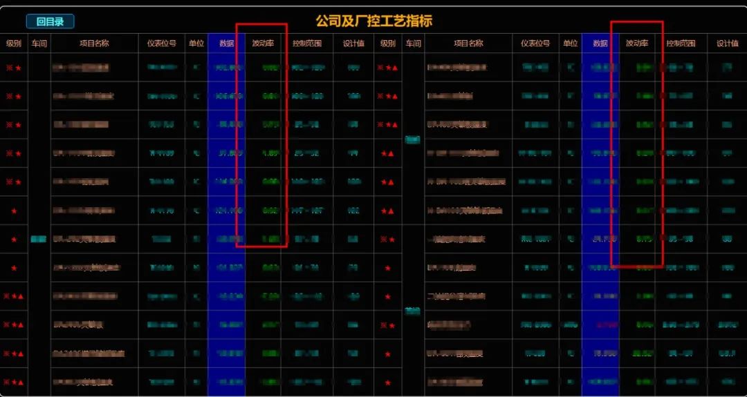 指标波动率实时监控通过数据库函数计算工艺指标每天早8点到次日早8点之间,指标控制波动情况并实时展示出来。目前实现了对24个公司级和厂级指标、52个关键工艺指标和23个车间竞赛指标的波动率实时监控。