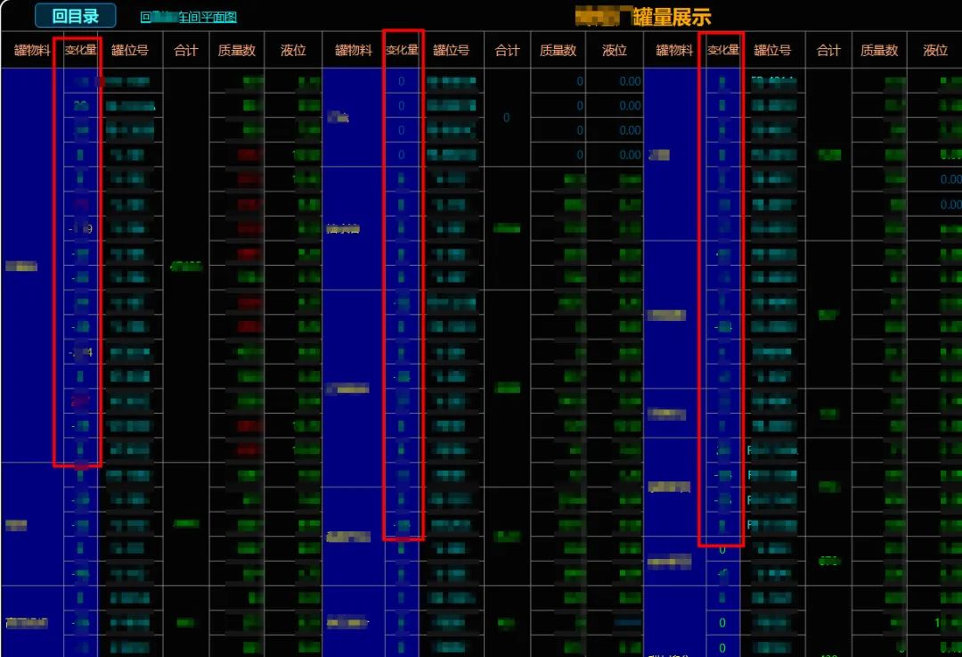 物料罐状态实时模拟根据罐量变化数据点,显示一段时间内罐量变化情况,通过数据大小显示目前罐收付状态。正数表示罐正在收料,负数表示罐正在付料。同时剔除数据散点波动干扰,数据可近似于最大值到最小值。