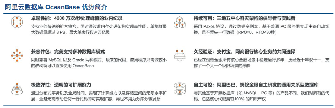 OceanBase 是阿里巴巴和蚂蚁金服 100% 自主研发的金融级分布式关系数据库,在普通硬件上实现金融级高可用,在金融行业首创“三地五中心”城市级故障自动无损容灾新标准,同时具备在线水平扩展能力,创造了 4200 万次/秒处理峰值的业内纪录,在功能、稳定性、可扩展性、性能方面都经历过严格的检验。