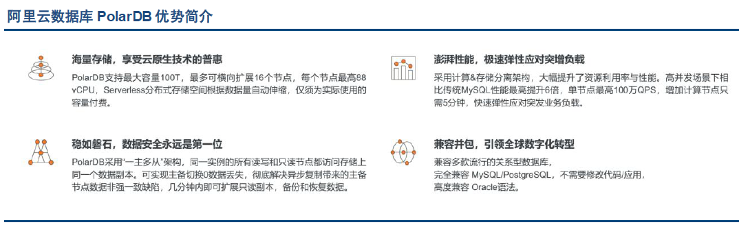 云原生数据库技术:PolarDB 通过IO 路径旁路化、创新的一致性协议、物理复制等技术,实现了领先的云原生数据库能力,性价比是传统数据库的10 倍。 智能化数据库技术:DBaaS 平台具体多方面的自动化能力,基于人工智能技术,实现了参数自调优、内存使用自调优、故障自处理等。 数据库安全技术:国内首家提供BYOK 的云数据库服务商,从用户连接、数据传输,到数据存储,提供了完整的全链路加密。 分析数据库技术:AnalyticDB 是最快的实时分析数据库,在全球权威分析型基准试TPC-DS 榜单中位列第一名。 关系型分布式云原生数据库PolarDB:PolarDB 是阿里巴巴自主研发的下一代关系型分布式云原生数据库,目前兼容三种数据库引擎:MySQL、PostgreSQL、高度兼容Oracle 语法。计算能力最高可扩展至1000 核以上,存储容量最高可达 100T。经过阿里巴巴双十一活动的最佳实践。