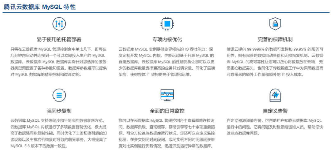 腾讯云数据库 MySQL(TencentDB for MySQL)为用户提供安全可靠,易于维护的数据库服务。MySQL是世界上最流行的开源关系数据库,通过腾讯云数据库 MySQL,您可实现分钟级别的数据库部署和弹性扩展,不仅经济实惠,而且稳定可靠,易于运维。云数据库 MySQL 提供备份恢复、监控、容灾、快速扩容、数据传输等全套解决方案,为您简化数据库运维工作,使您能更加专注于业务发展。