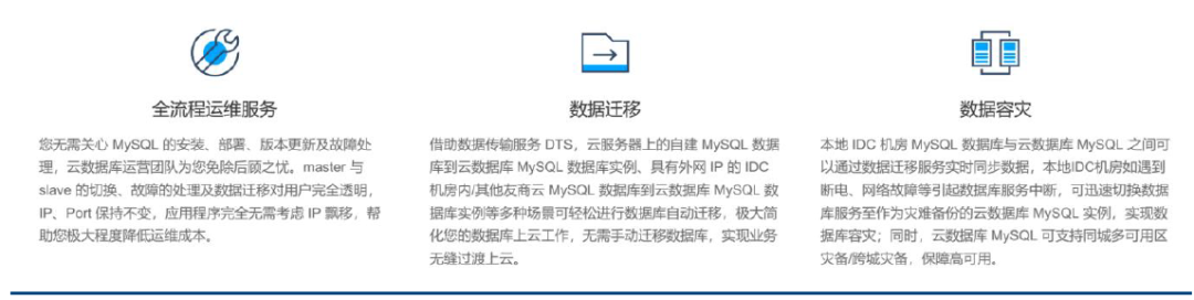 云数据库是指被优化或部署到一个虚拟计算环境中的数据库,可以实现按需付费、按需扩展、高可用性以及存储整合等优势。根据数据库类型一般分为关系型数据库和非关系型数据库(NoSQL 数据库)。云数据库的特性有:实例创建快速、支持只读实例、读写分离、故障自动切换、数据备份、Binlog 备份、SQL 审计、访问白名单、监控与消息通知等。