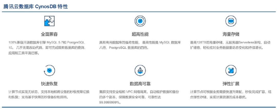 腾讯云数据库 CynosDB(TencentDB for CynosDB) 是腾讯云自研的新一代高性能高可用的企业级分布式云数据库。融合了传统数据库、云计算与新硬件技术的优势,100%兼容 MySQL 和 PostgreSQL,实现超百万级QPS 的高吞吐,128TB 海量分布式智能存储,保障数据安全可靠。