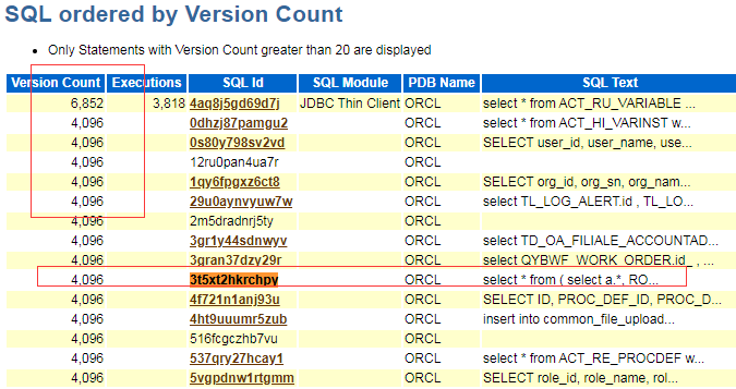 highversion count指的就是childcursor总数很高。在AWR报告中,默认verioncount超过20的SQL就会显示在orderby version count中。根据经验versioncount如果超过100,可能就需要引起注意了。
