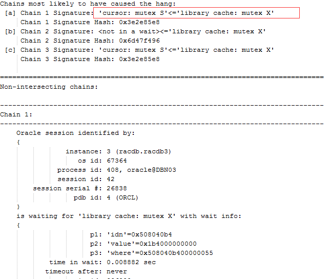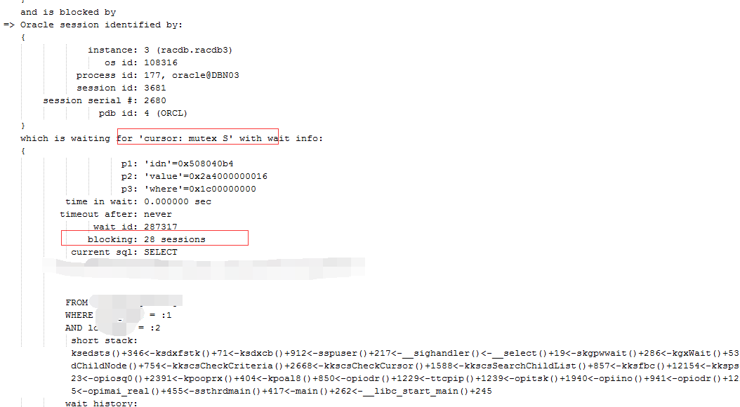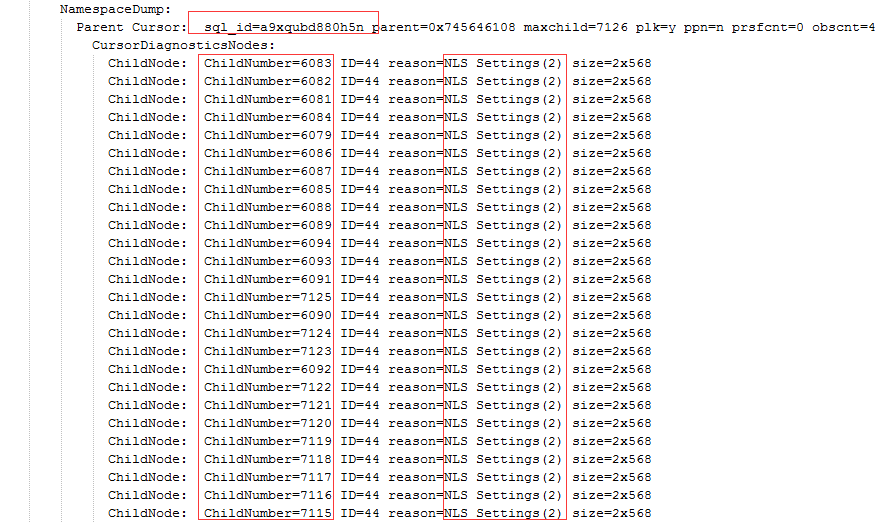 通过hang分析日志我们可以看到Blcoking其他session的会话操作是查找子Currsor,所以故障大概率是由于子Cursor过多,进行查找时发生等待导致。而产生大量的子Cursor的原因是NLSSettings。