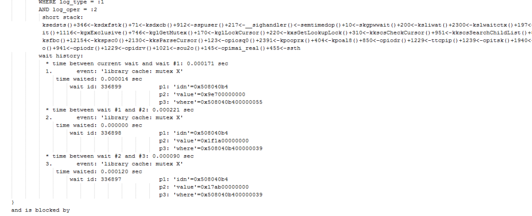 从上图我们可以看到多个会话同时执行SQL_ID:3t5xt2hkrchpy,a9xqubd880h5n,且堵塞源不停在变,会话相互之间发生cursor:mutex X等待。
