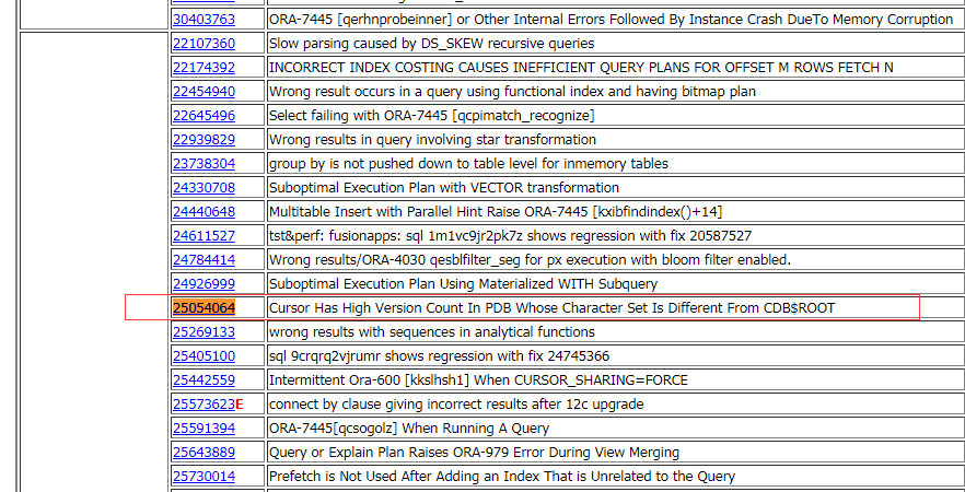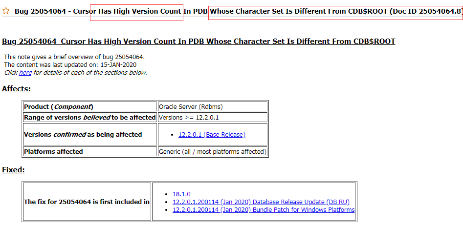 5、综上所述,我们发现本次故障大概率是由于highversion count导致,那为啥这么多SQL的versioncount都这么高呢,初步怀疑是触发BUG了,我们这库是CDB模式,并且多个PDB的字符集不一致,通过MOS查找到一篇类似的文章:
