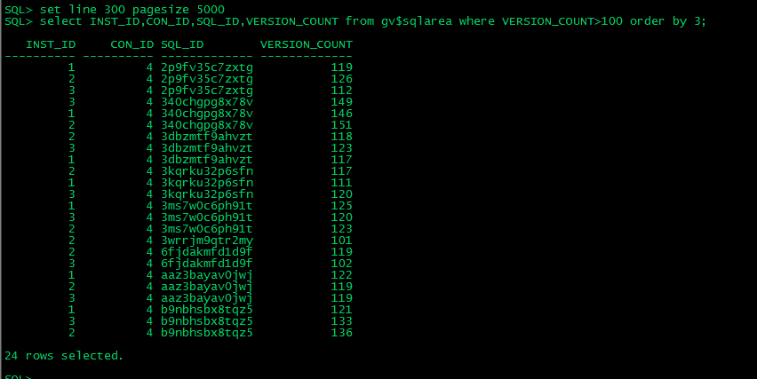 SQL>select address,hash_value,version_count from v$sqlarea wheresql_id='a9x5sbz88kmfh';
