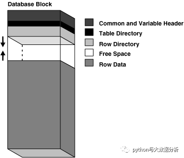 数据块由数据块头(header/Common and Variable),表目录区(Table Directory),行目录区(Row Directory),可用空间区(Free Space)和行数据(Row Data)五部分组成,如下图所示: