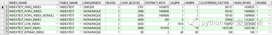 SELECT a.index_name,a.table_name,a.uniqueness,a.blevel,a.leaf_blocks,a.distinct_keys,a.avg_leaf_blocks_per_key albpk,a.avg_data_blocks_per_key adbpk,a.clustering_factor,a.num_rows,a.degree
