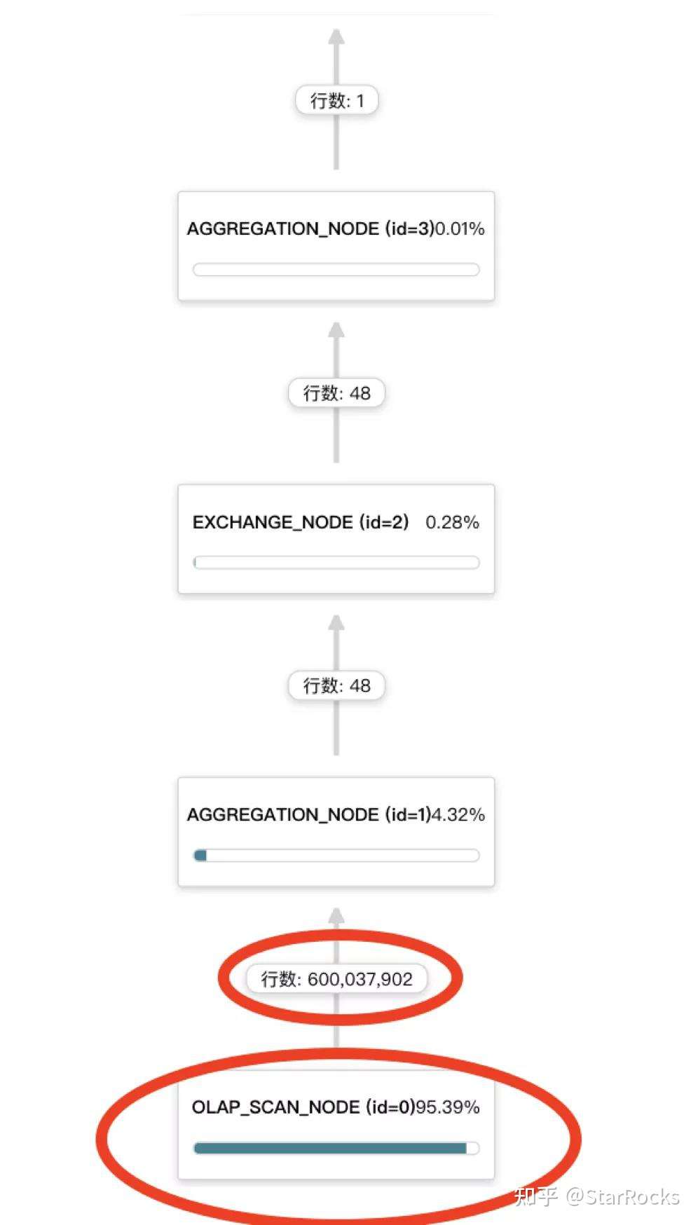 - 每个节点(算子)的进度条是执行时间占比。能直观地看到全局图中哪些节点耗 CPU 多、Scan 时间长;