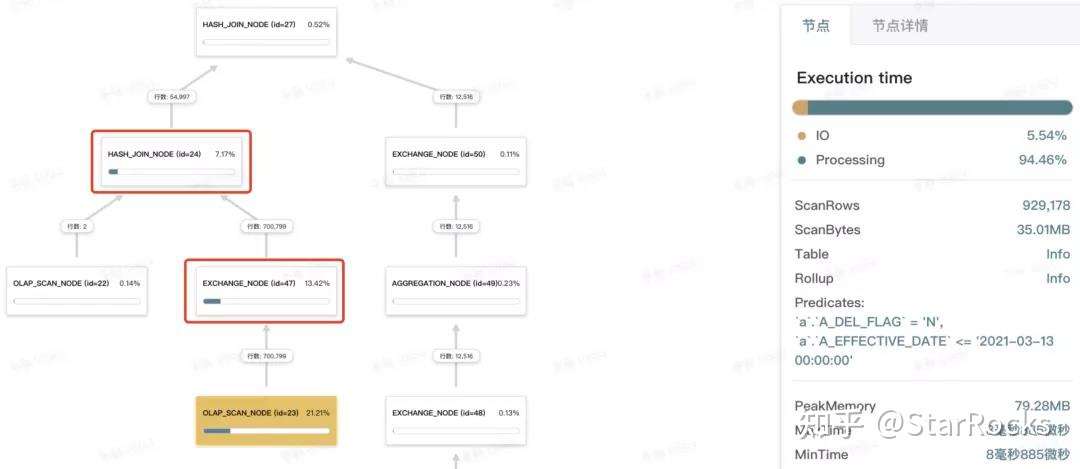 - 同时,可以看到左节点 OLAP_SCAN_NODE 返回的行数也变少了很多(见上下图中黄底的节点)。这个功能叫「Join 的右表往左表谓词下推」:右表过滤结果很小时,StarRocks可能会将右表谓词往左表下推,从而直接减少了左表的返回数据量(可以通过设置 hash_join_push_down_right_table 开关变量来验证效果)。