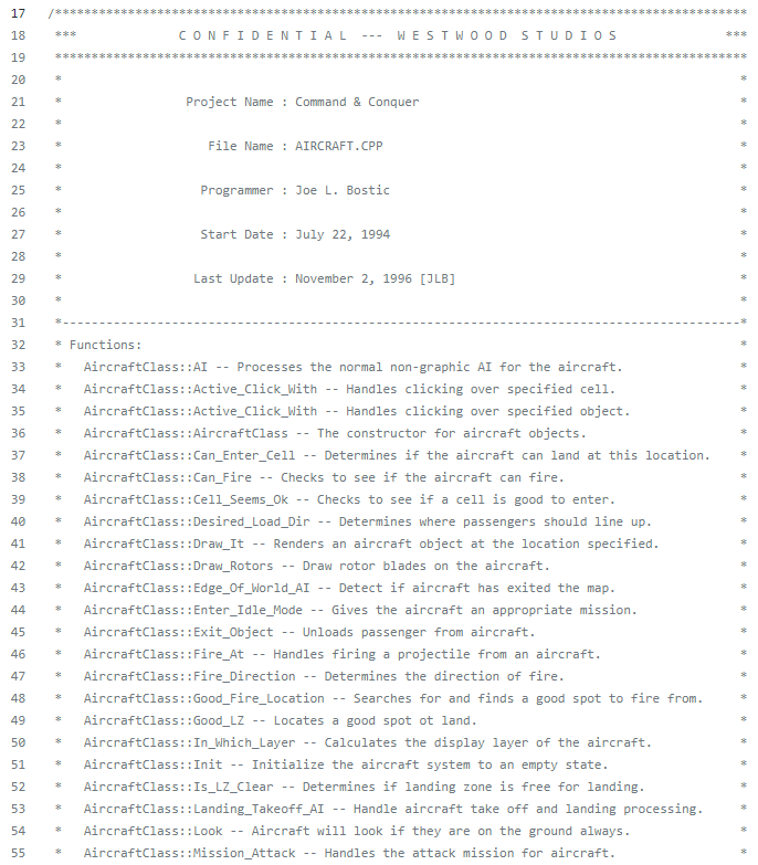 如下这段是来自红警游戏飞行器的源文件AIRCRAFT.CPP,可以看到,文件头列出了所有函数的功能,一目了然,