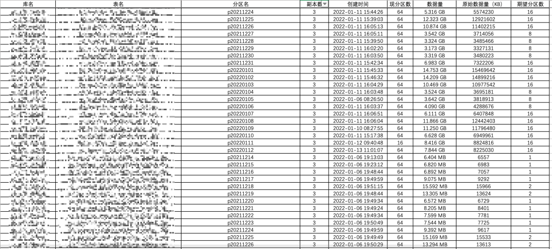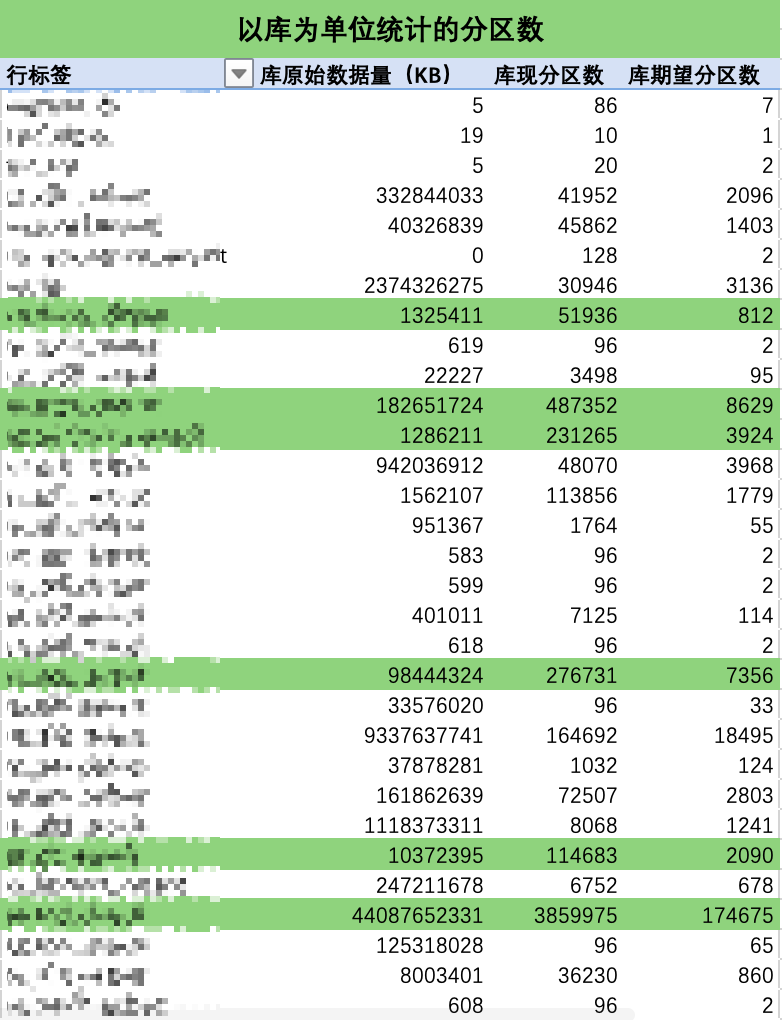 结合 Excel 优秀的透视表功能,即可轻松获取表粒度、以及库粒度下的治理建议统计表,最终治理目标也是依据计算出来的总期望分区数得到。以库粒度做统计截取部分数据如下所示: