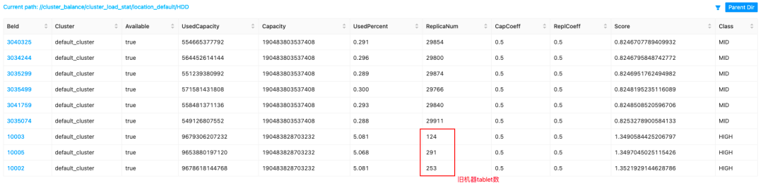 结论是不行,当我将 balance_load_score_threshold 调到 0.4 之后,旧机器的标签都变成了 MID,但是新旧机器的 tablet 仍然保持着悬殊的差距。这是因为迁移策略只会从 mid -> low 或者 high -> mid,mid -> mid 不会触发负载均衡,相关源码见:BeLoadRebalancer.java 的 selectAlternativeTabletsForCluster( ) 方法。