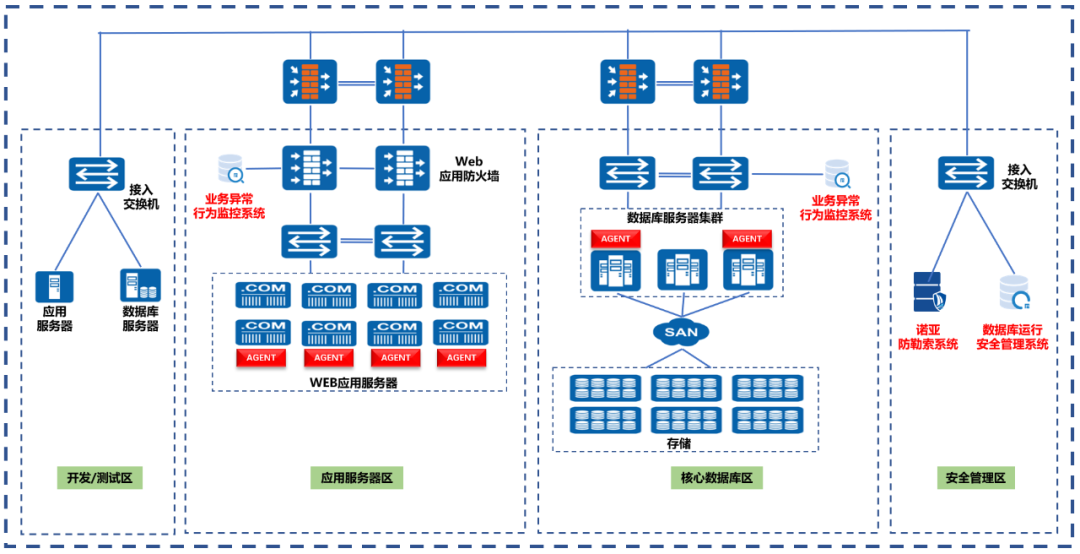 通过在核心数据库区和应用服务器区分别部署业务异常行为监控系统,将数据通过镜像引流进行分析,主要实现功能: