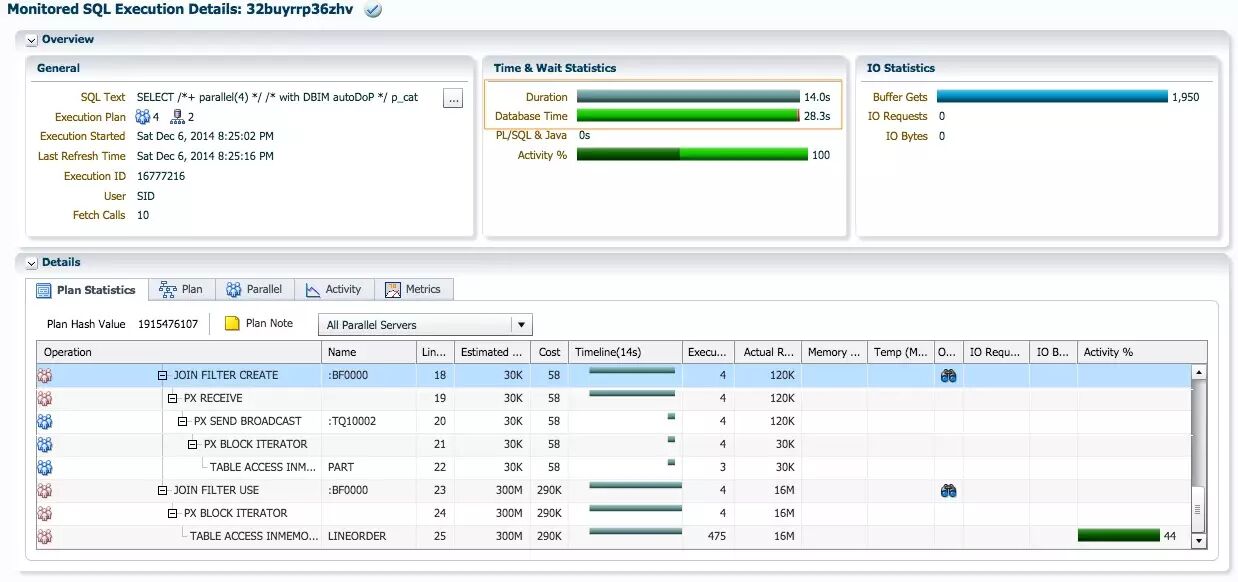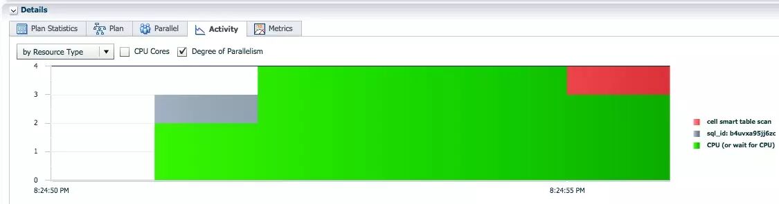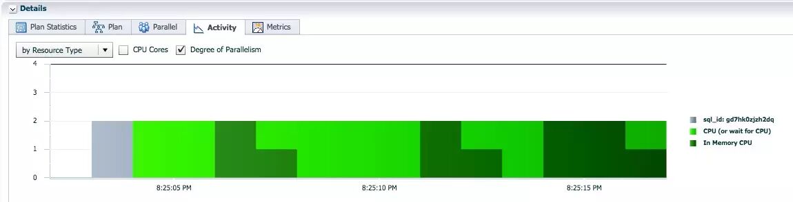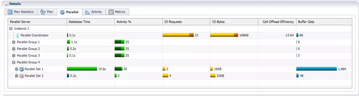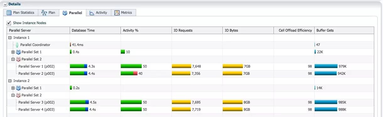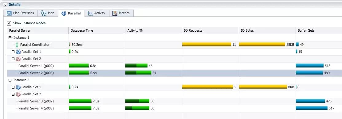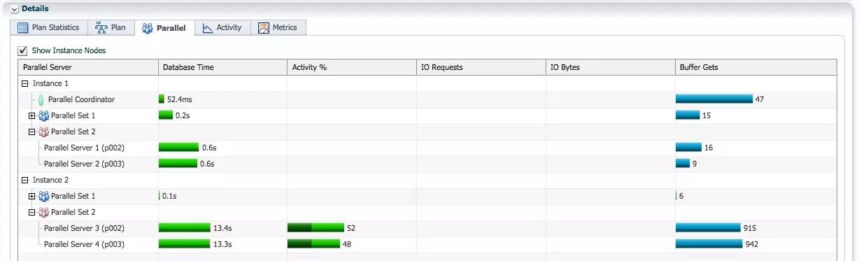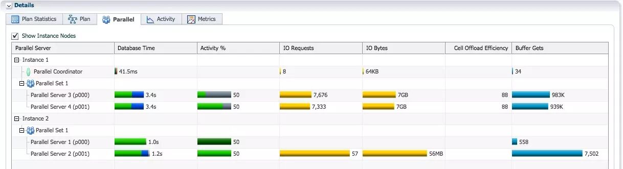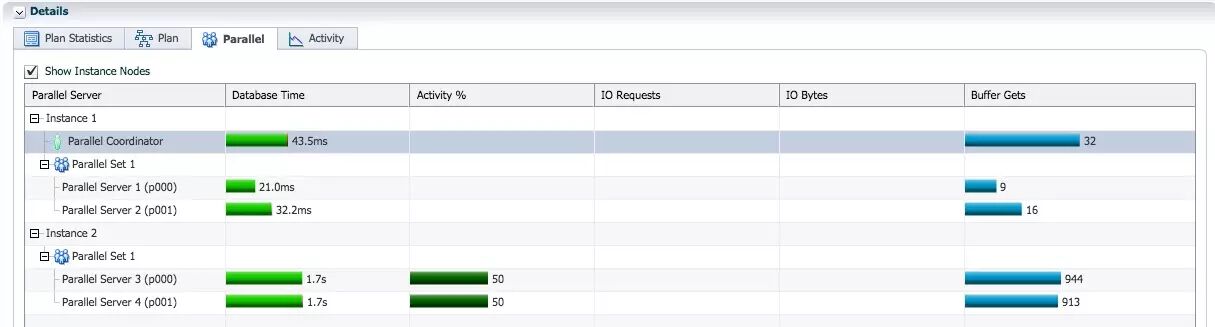 从 sql monitor report 中的 parallel 标签中可以看到,实例 1 和实例 2 的 parallel set 2 的工作量的平均的。sql 执行的 AAS (average active sessions)=4,两个实例的 4 个并行平均分担了工作。