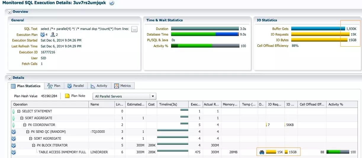 当 parallel_degree_policy=manual 时,执行时间为 3s,db time 为 9s。执行需要出现 1.9M 的 buffer gets,15GB 的物理读,为表大小的一半。并行扫描的工作方式为“PX BLOCK ITERATOR”,px granule 为 rowid range,实例 1 和 2 上的并行进程平均扫描lineorder。QC 此时并没有意识到大部分 IMCU 都分布在实例 2 上,实例 1 需要通过物理读获取数据,大部分物理读出现在实例 1。Cell Offload Efficiency=88%,通过 Smart Scan 把数据扫描过滤工作卸载到存储节点,15GB 的物理 IO 请求,卸载到存储节点扫描处理之后,只需返回 2GB 给实例 1,大大节省了计算节点的 CPU。