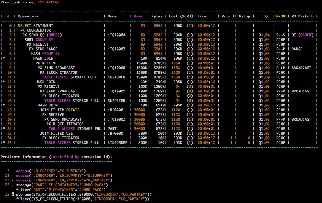 三次执行的执行计划是一样的,Plan Hash Value=1915476107,这是一个典型的右深树,三个维表的分发方式都为 broadcast。执行计划 18 行为 JOIN FILTER CREATE,为扫描维度表 part 分发之后创建的 bloom filter(:BF0000);25 行在扫描 lineorder 的时候使用 bloom filter(:BF0000) 作为过滤条件,predicate information 部分显示 25 行的条件为: