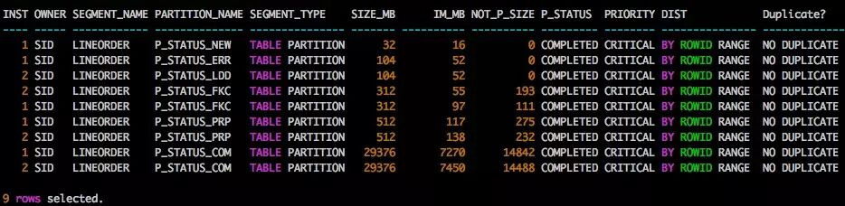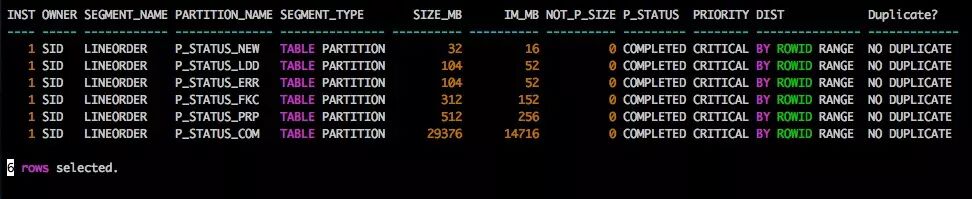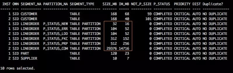 By rowed range 重新分布之后,P_STATUS_FKC/P_STATUS_PRP/P_STATUS_COM 三个分区的 IMCU 分布在两个实例上。Bytes_not_populated 列不为 0,说明这个 segment 有多少数据不在本实例加载。对于最大的分区,P_STATUS_COM 平均分布在两个实例上。