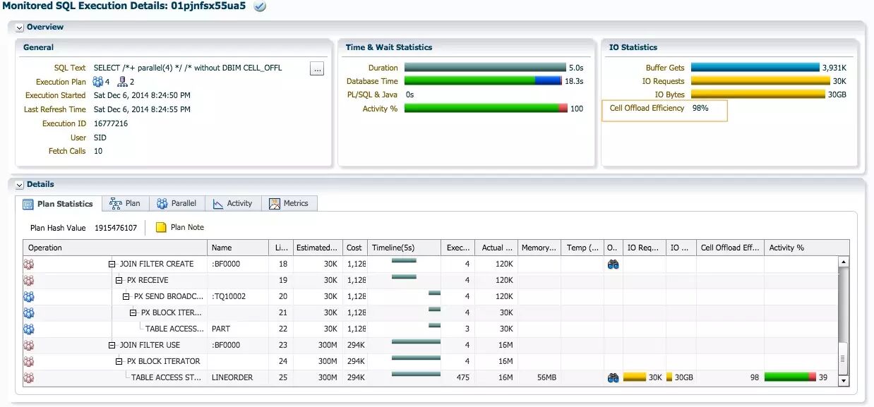 Cell Offload Efficiency 为 98%,意味着当扫描 Lineorder 时,通过 Smart Scan 的 column projection 和 bloom filter 特性,数据扫描和过滤过程被卸载到存储节点,从存储节点返回的实际数据量大小只有 30GB 的 2%=630MB,说明这个 sql 本身非常适合发挥 Exadata 的威力。