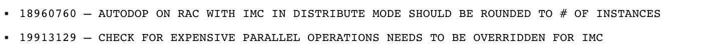 Bug 18960760(已经在 12.1.0.2.0 包含这个 fix)中对于 IMC 查询跳过了条件 1,如果查询中存在一个 IMC 表被分布到多个实例。但是查询相对较小的 IMC 表时,DoP 可以依然可能为 1 或者不足实例的个数,Bug 19913129 会绕过第 2 个条件(目前这个 fix 还没发布)。