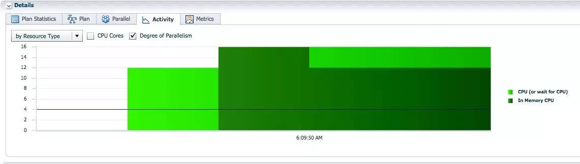 使用 In-memory aggregation,sql 执行接近 4s,db time 为 12.3s,说明整个执行计划效率更高,消耗的资源更少,并行执行有 4 个 parallel group,AAS 最高的时候为 16。在设计中,优化器对于 Vector group by transformation 的代价估算趋于保守,虽然有些场景使用 vector group by transformation 执行时间更短,但是优化器对 vector group by transformation 执行计划的 cost 估算更高,所以默认没有选择进行 vector group by transformation。实际使用可能需要使用 VECTOR_TRANSFORMhint 手动打开这个特性。
