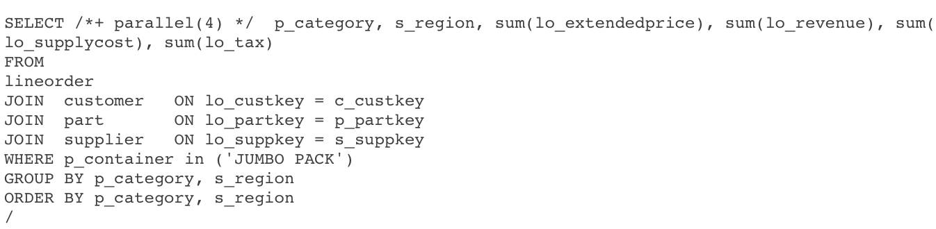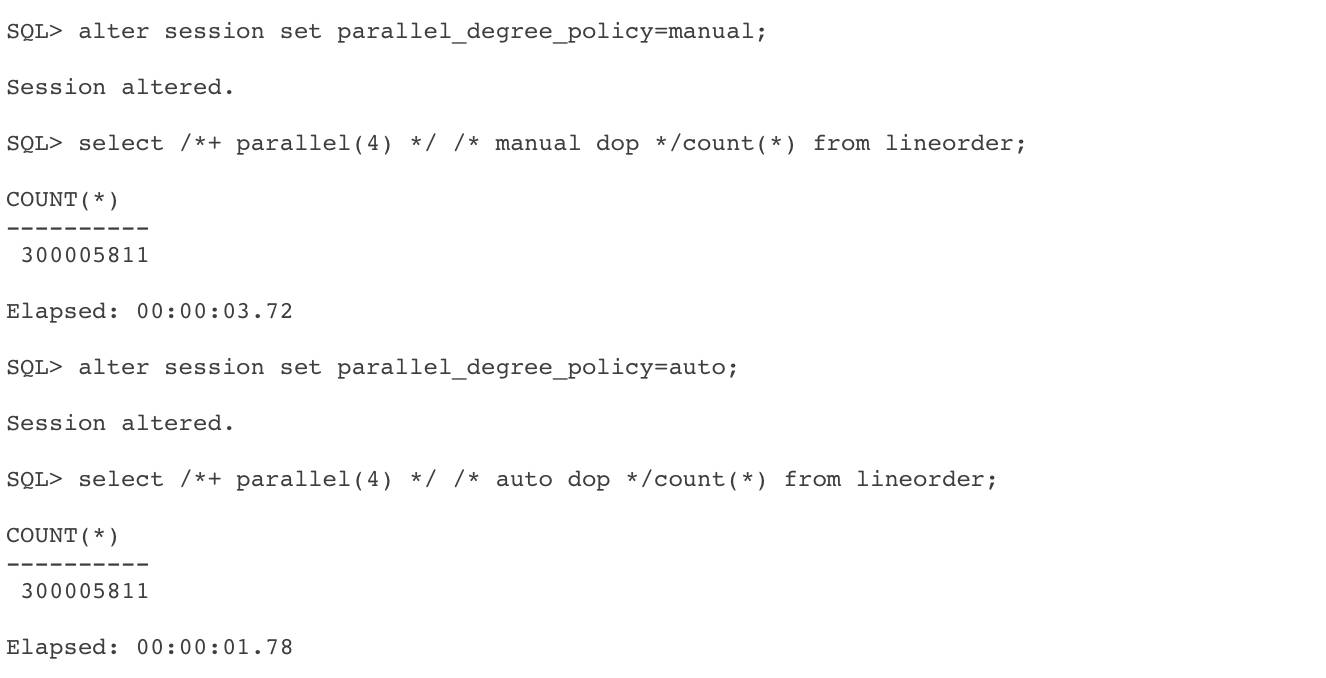 在 AutoDoP 模式下通过 hint 或者在 session 级别指定并行度,就像之前的例子中在 sql 中使用 parallel(4):