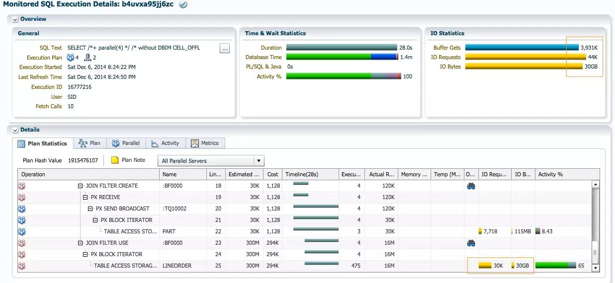 不使用 Smart Scan,sql 执行时间为 28s;db time(QC 加上所有并行进程使用的 db time 之和)为 1.4 分钟,其中对 Lineorder 表的扫描过滤花了 65% 的 db time,为 54.6s,因为计算节点的并行进程需要通过直接路径读,扫描 Lineorder 全部 30GB 的数据,同时使用 bloom filter 进行过滤。SQL 执行需要花费大量 IO 和 CPU 资源进行物理读和过滤,这是非 Exadata 平台分析型应用的典型瓶颈。