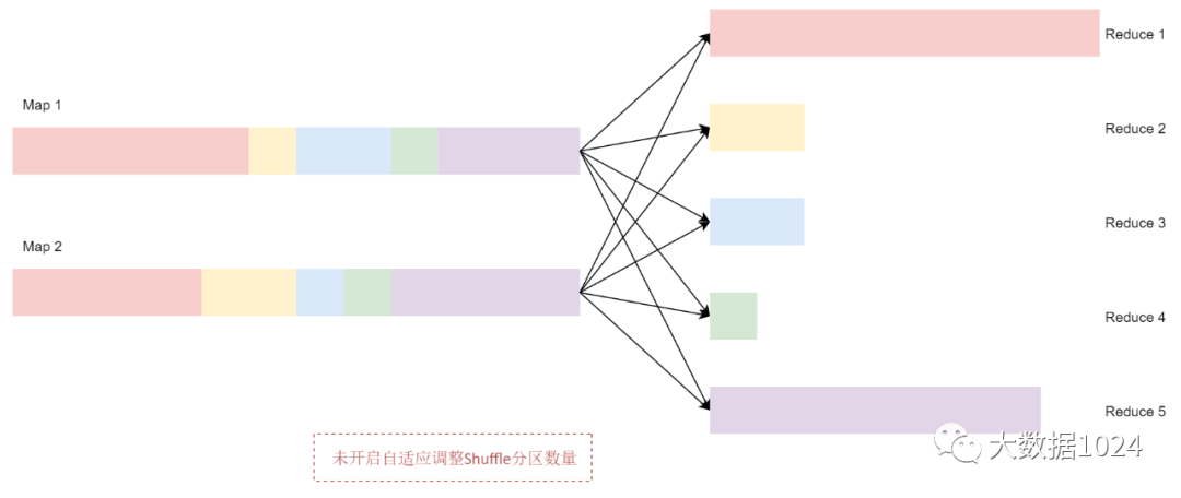 现在我们把初始的Shuffle 分区数量设置为5,所以在 Shuffle 过程中数据会产生5 个分区。如果没有开启自适应调整Shuffle分区数量这个策略,Spark会启动5个Recuce任务来完成最后的聚合。但是这里面有3个非常小的分区,为每个分区分别启动一个单独的任务会浪费资源,并且也无法提高执行效率。因为这3个非常小的分区对应的任务很快就执行完了,另外2个比较大的分区对应的任务需要执行很长时间,资源没有被充分利用到。